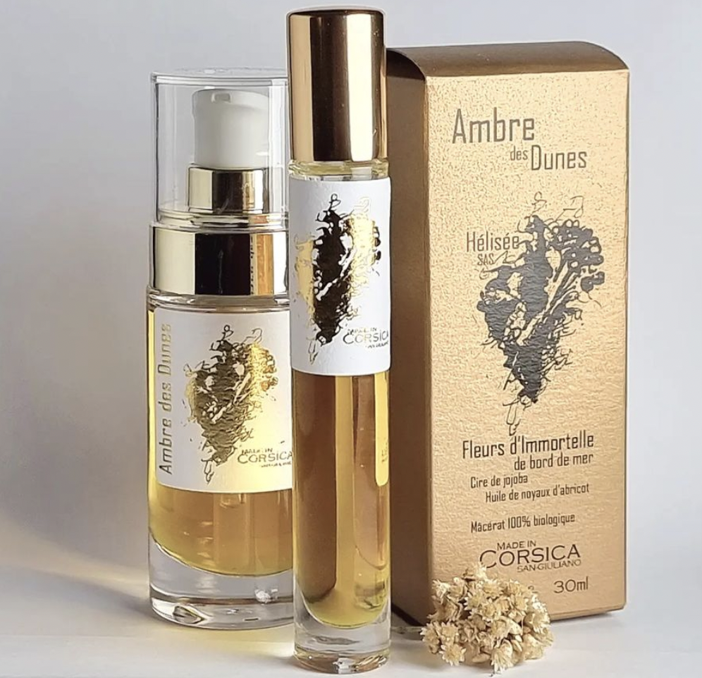 Les deux formats de flacon du sérum de beauté que je fabrique avec mes fleurs d’immortelle (le spray de 30 ml et le roll on pour le sac ou le voyage de 10 ml). Je ne distille pas et mon sérum est certifié sans huile essentielle : je fais macérer mes fleurs dans la cire de Jojoba et l’huile de noyaux d’abricots durant plusieurs mois.