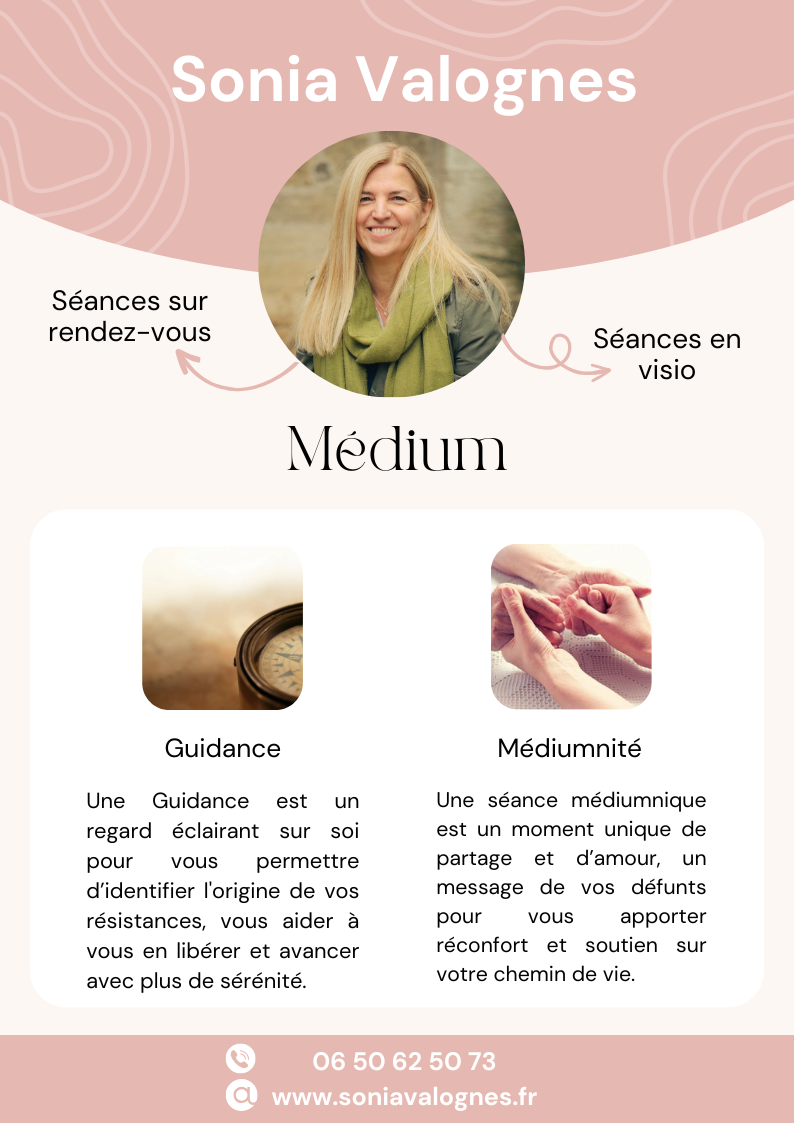 Je suis Sonia Valognes, Médium et accompagnante en Guidance Énergétique. J’accompagne les personnes qui ressentent des tensions et des blocages émotionnels dont elles ne comprennent pas toujours l’origine, ni le sens. C’est en les guidant vers la mise en lumière de leurs résistances, que je les aide à réactiver leurs propres pouvoir intérieur et ainsi à se libérer pour avancer avec plus de sérénité. La Guidance Energétique est avant tout un regard éclairant sur soi, sur son être intérieur dans sa globalité (corps, âme, esprit) qui vous apporte une prise de recul sur votre problématique, un apaisement sur votre état présent car chaque message canalisé et transmis est un véritable soin de l’âme et du corps.