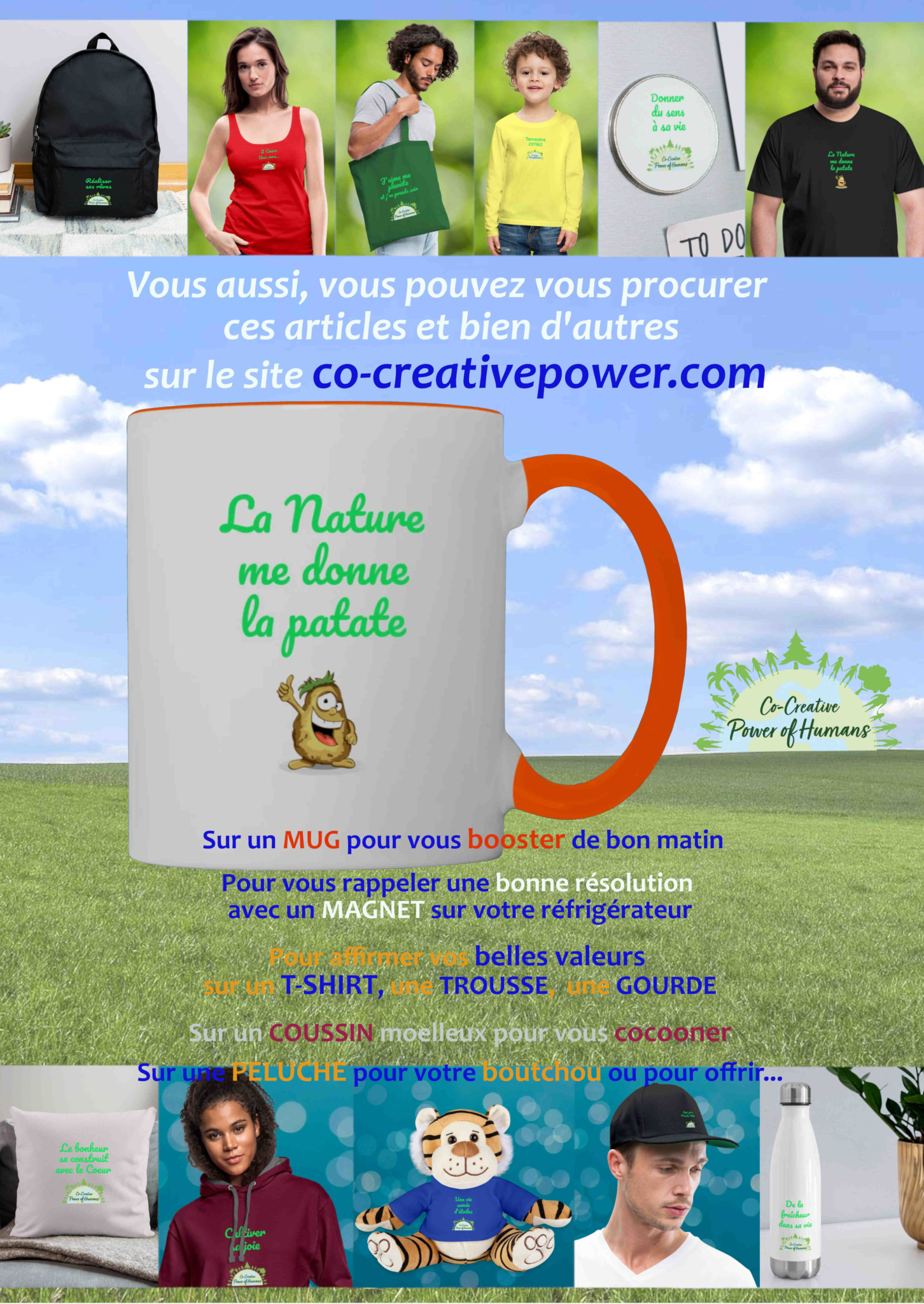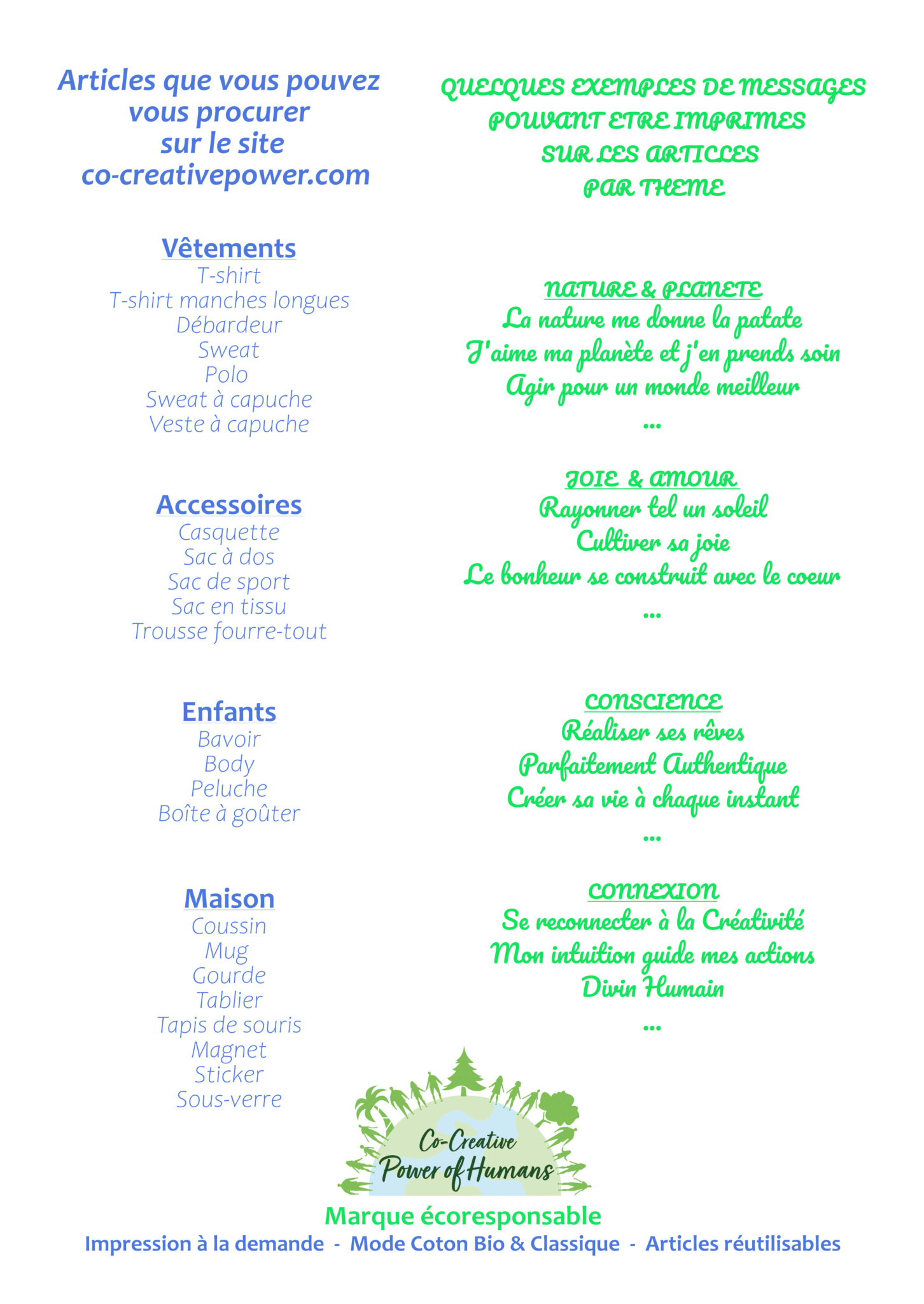 Tous les objets de la marque Co-creative Power of Humans sont exposés, afin de se rendre compte de la QUALITE des PRODUITS et la QUALITE d’IMPRESSION des messages. Pour les textiles sont disponibles en coton classique ou coton bio (label GOTS).
