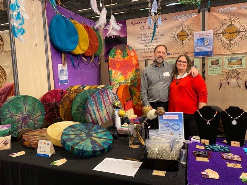 Nous sommes partenaires des tambours Unis-Son et Tambour-Unité. Cette année nous proposerons également des tambours de pouvoir. C’est un grand tambour rond de presque 1m de diamètre. On l’installe sur un socle pour pouvoir en jouer debout à 1, 2, 3 voire 4 personnes en même temps. Nous l’utilisons surtout lors de cercles de tambours mais aussi à l’occasion de nos concerts chamaniques. Il s’intègre très bien également lors de méditations guidées.